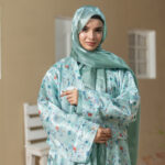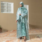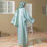 Elegant three-piece Eid abaya set featuring floral printed coat, matching inner, and soft scarf in refreshing azure tones.