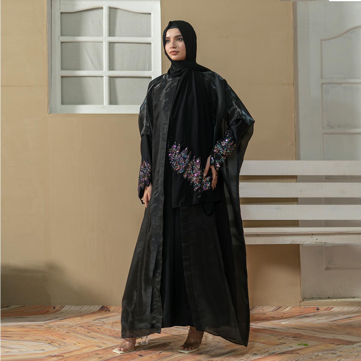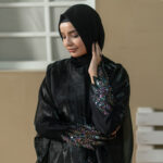 The subtle shine of the coat fabric, paired with hand-embellished sleeve detailing and statement scarf work creates a refined yet festive look. Perfect for Eid, evening gatherings, formal dinners, and special occasions, this abaya blends modest sophistication with modern luxury styling.