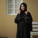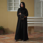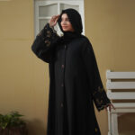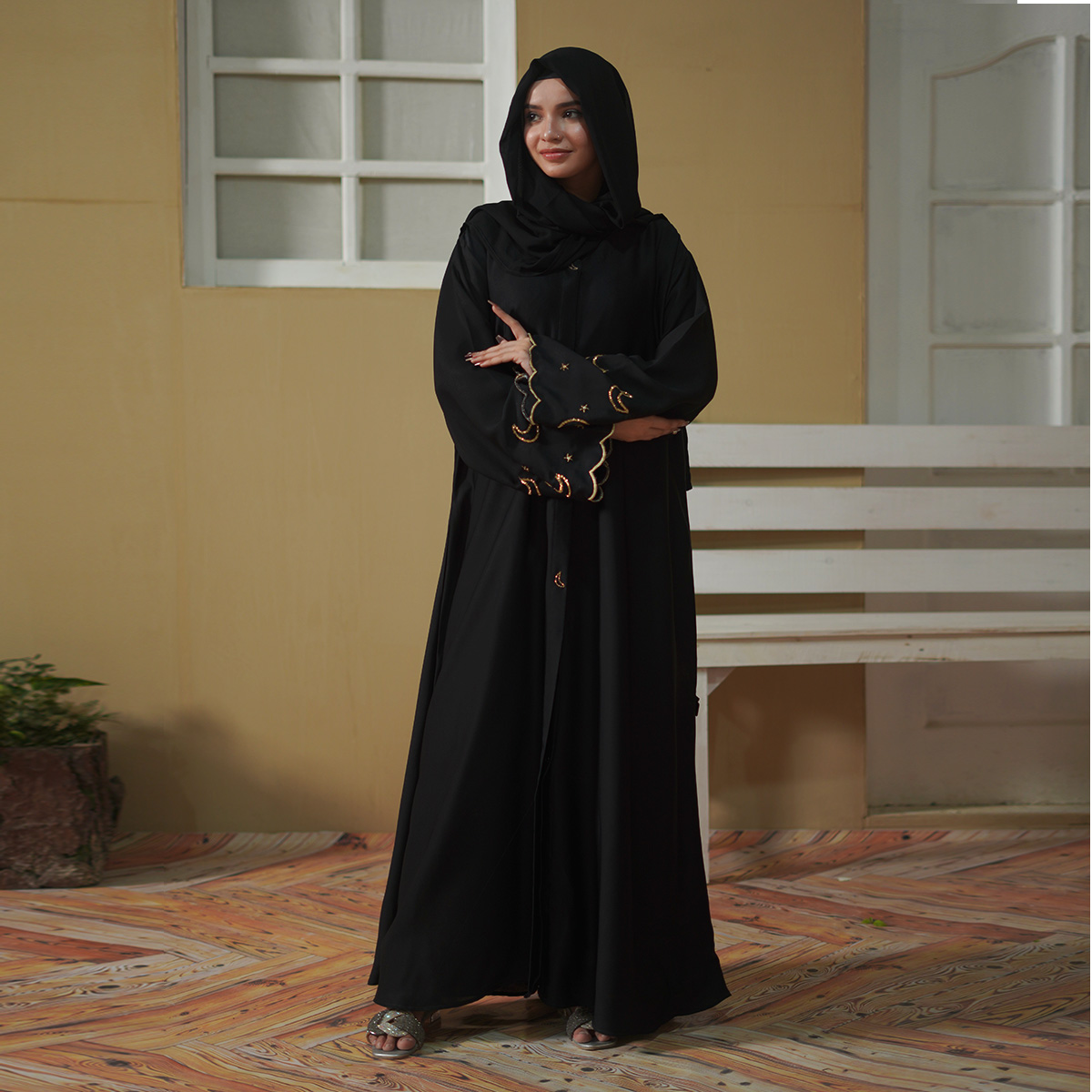 The refined embellishments add a soft, festive glow without overpowering the classic black silhouette. Perfect for Eid, formal gatherings, evening events, and special occasions, this abaya blends modest sophistication with artisanal craftsmanship.
