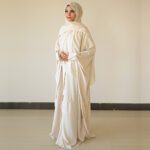 The highlight of this abaya is the mesmerizing calligraphic art embroidery adorning the back. Each intricate stroke is a testament to the beauty of Arabic script. The embroidery is a stunning focal point that sets this abaya apart. In addition to the exquisite embroidery, the sleeves feature delicate detailing with a brooch, adding a hint of glamour to the overall design. This attention to detail further enhances the beauty of the Ivory Arabic Cape Abaya, making it a true masterpiece.