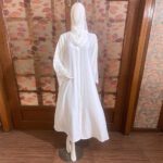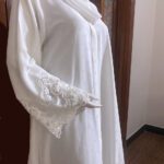 The standout feature of this abaya is the intricate lace details on the sleeves, adding a touch of femininity and charm. The delicate lacework showcases beautiful patterns and textures, creating an elegant contrast against the white fabric.