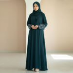 A premium teal green abaya crafted in soft Nidah fabric with elegant stone-embellished sleeves.